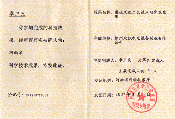柔性就地風(fēng)選工藝技術(shù)獲