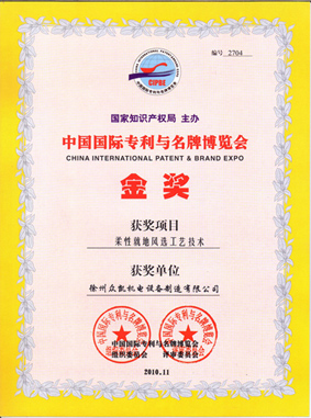 徐州眾凱公司由徐州市科技局組織本市重點自主創新技術產品組團參加了本次國際專利與名牌博覽會。在本次展會上,徐州眾凱公司擁有完全自主知識產權的創新技術產品---柔性就地風選工藝技術榮獲“金獎”。徐州眾凱公司同時獲得“專利優秀企業”稱號,并獲得證書及獎杯。