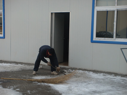 2月11日,徐州普降今冬第一場大雪。今天是上班最后一天,盡管道路很滑,大家依然按時到達公司。個別同事甚至一路步行過來上班。到公司后,發現早到的同事已經開始自覺的清掃積雪。由于昨晚下了大量凍雨,地面早已結冰,積雪掃干凈后,地面依然很滑。大家八仙過海各顯神通,有的拿掃帚、有的用鐵鍬、有的用鐵棍、鐵板等各種工具來鏟除滑冰,清理路面,以確保大家的出行安全及生產活動的正常開展。